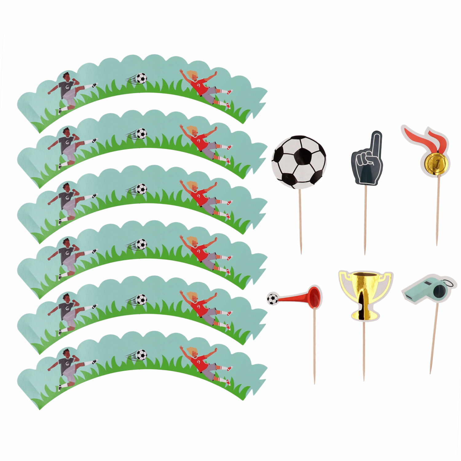 Cupcakes trakteren was nog nooit zo leuk met deze vrolijke voetbal decoratie set. De wikkels zijn voor cupcakes met een doorsnede van ongeveer 6 cm.