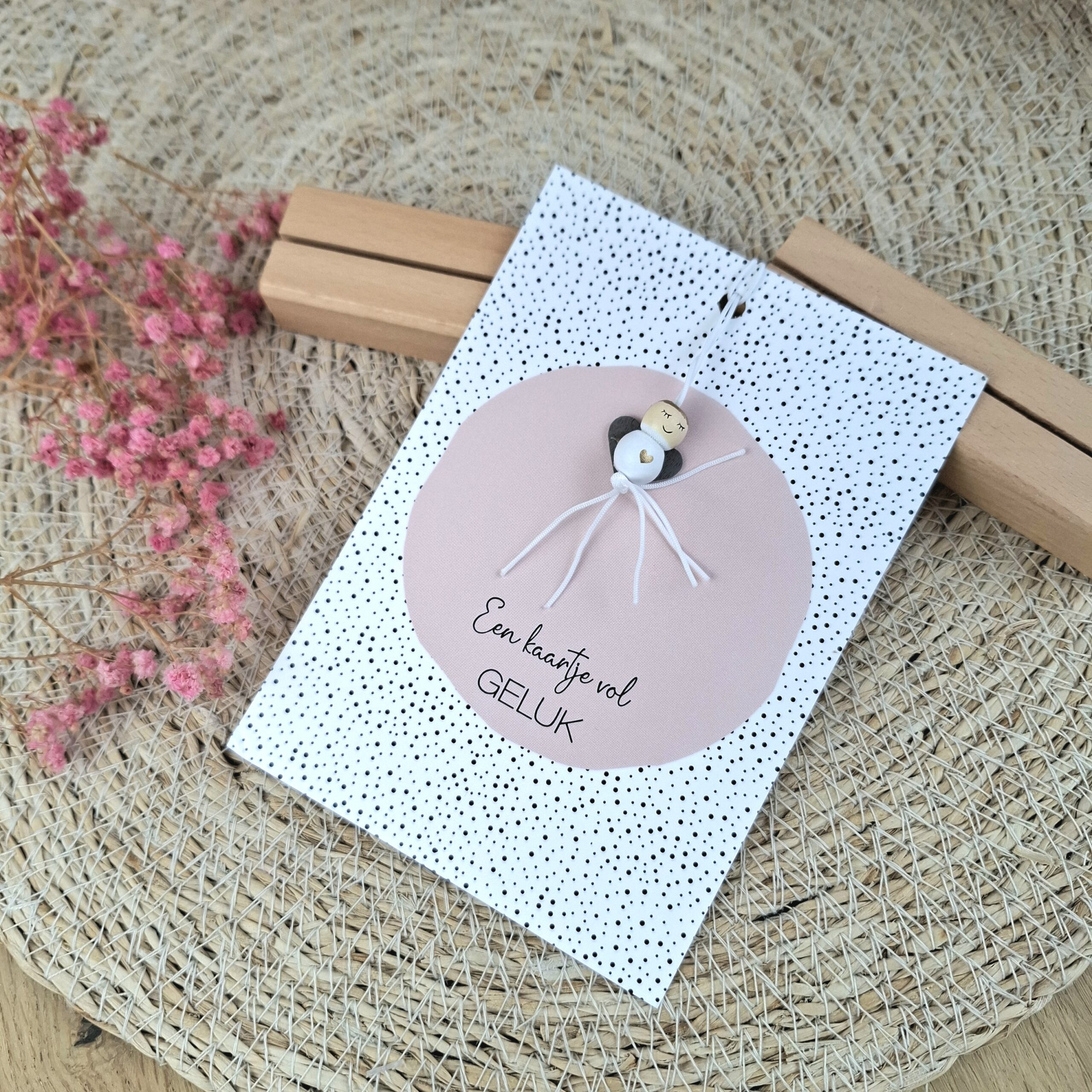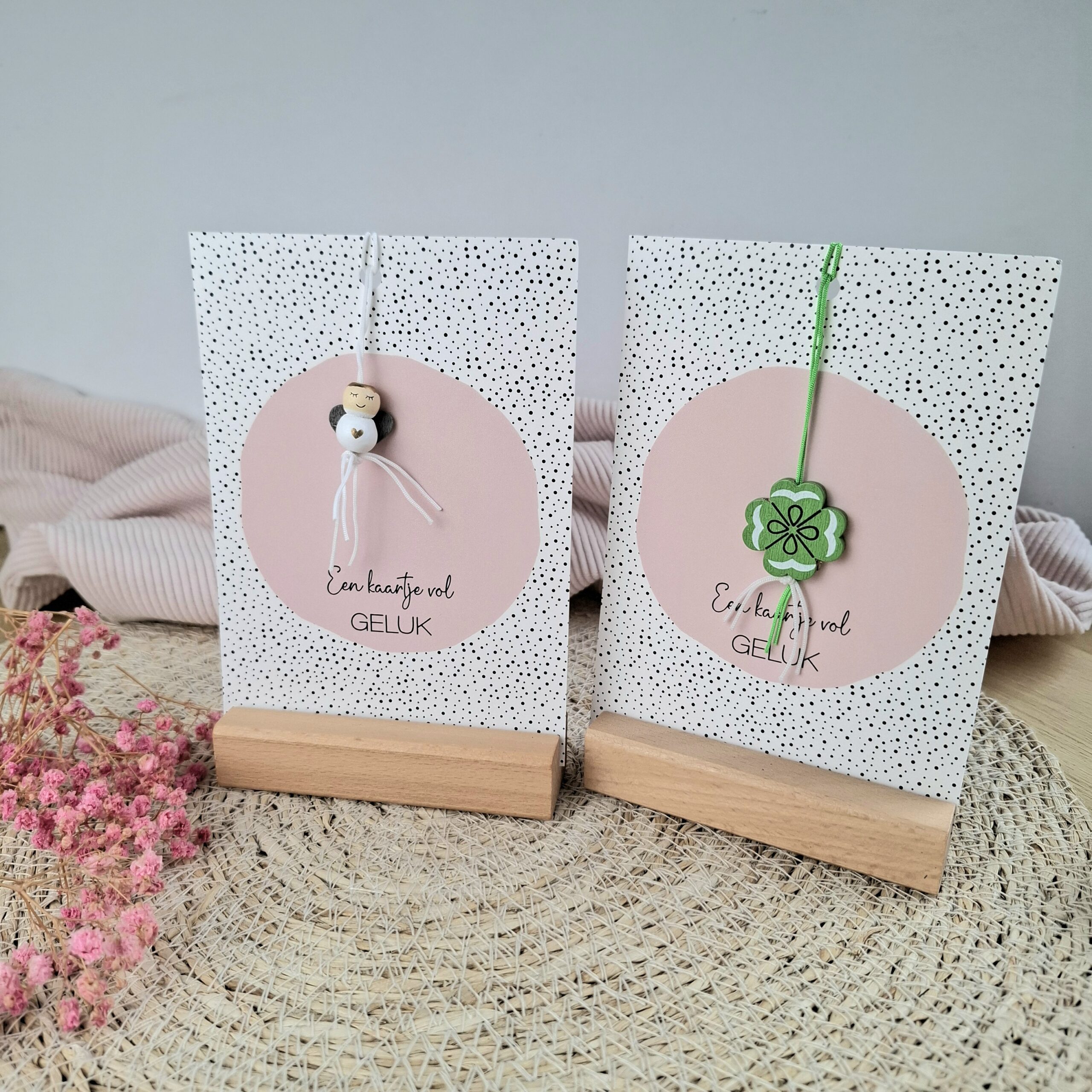 Wie kan er wel een beetje geluk gebruiken? Geef diegene dit leuke kaartje met engeltje of klavertje vier.