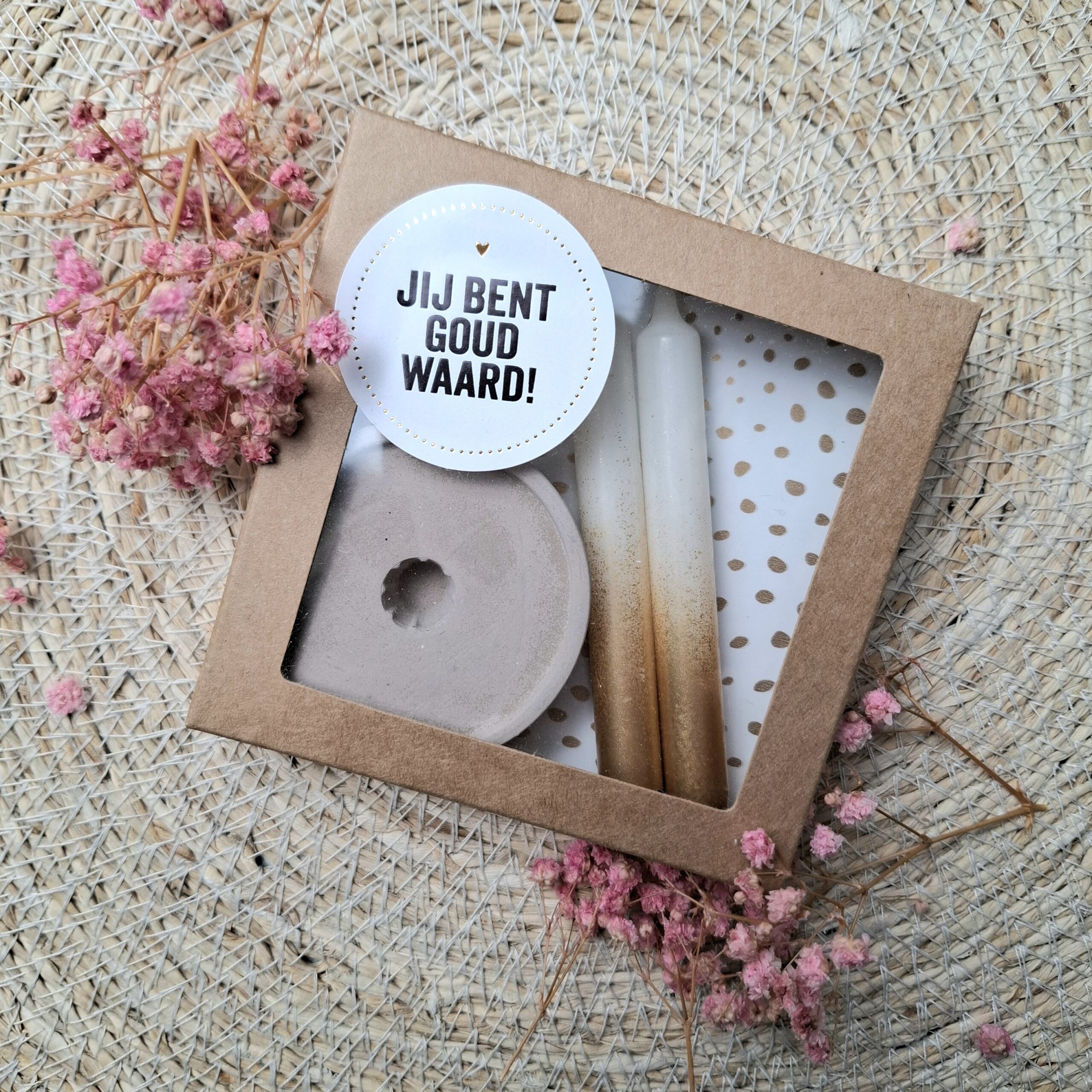 Gevuld venster cadeaudoosje | Jij bent goud waard met kaarsje en kaarsenhouder