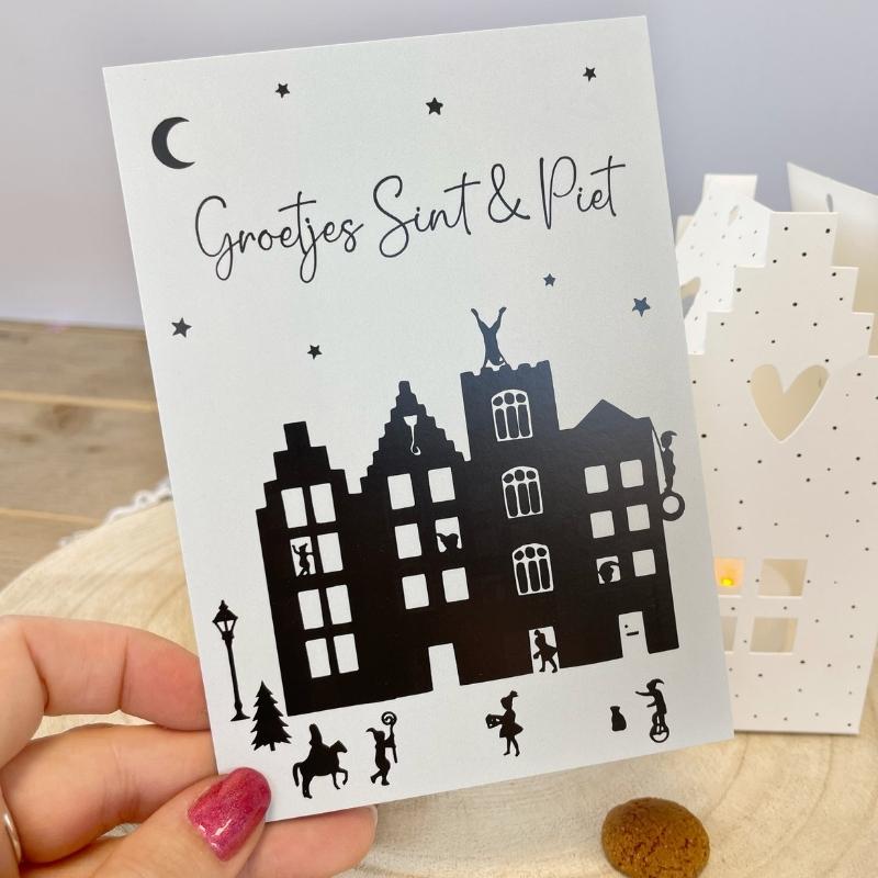 Mint kaartje met de huisjes voor de groetjes van Sint & Piet. Formaat: 10×15 cm