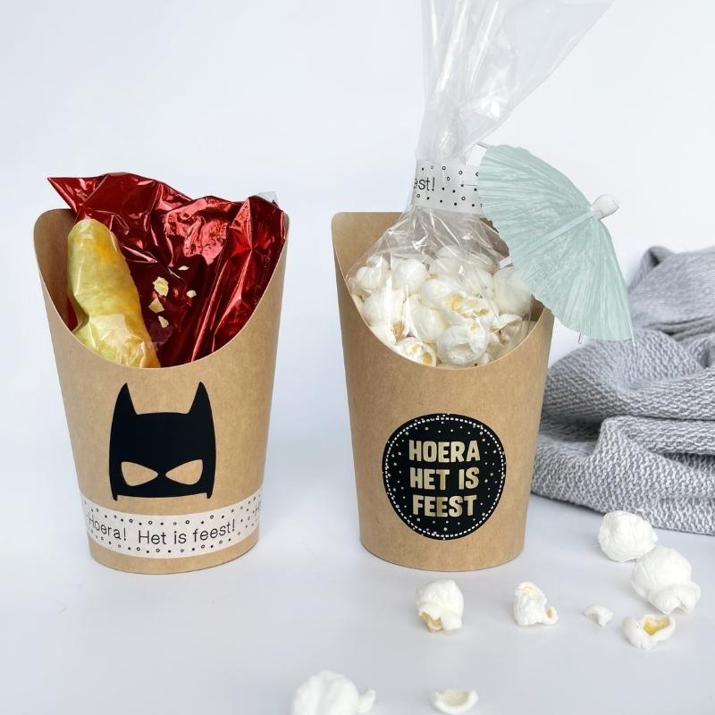 Je kunt de bekers zelf versieren met washitape en stickers. Vullen met iets lekkers en klaar. De puntzakken vind je ook in de webshop.