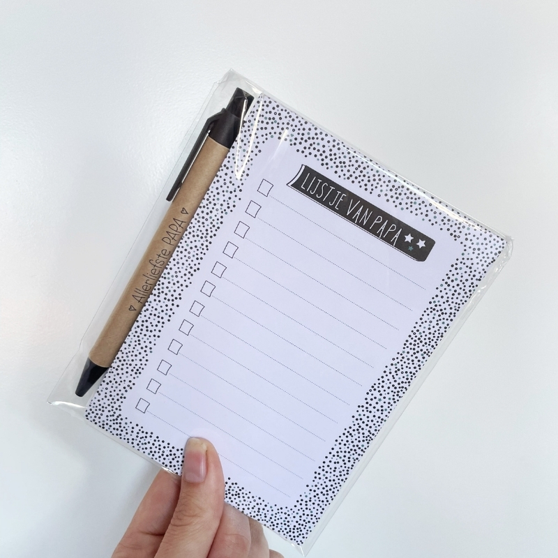 Hier wordt elke papa blij van. Een leuk en praktisch cadeau. In het zakje zit een kaart en notitieblokje (zelfde formaat 10,5 x 14,8cm) en een pen.